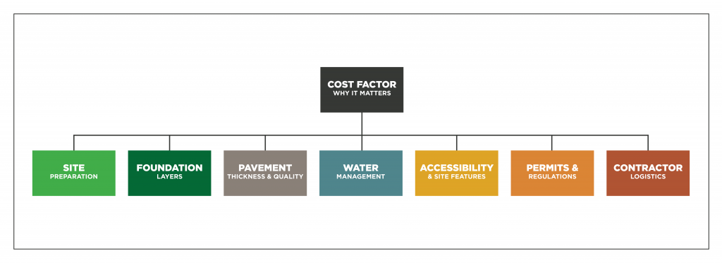 Accessibility & Site Features — Adding sidewalks, curbs, lighting, wheelchair-accessible ramps, painted lines, signs, and landscaping all contribute to the total cost.