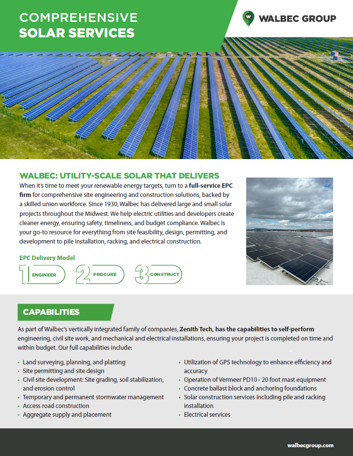 Solar developers and investors choose Walbec because we know how to scale with your vision. Backed by a seasoned union workforce, deep construction expertise, and a commitment to safety and quality, we deliver high-performing solar infrastructure—on time and on budget.